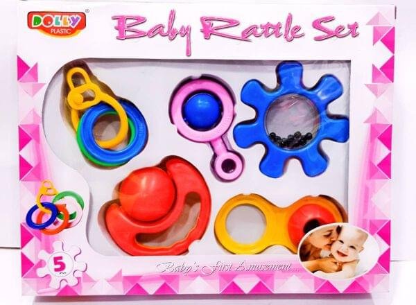 - The Baby Rattle Set is a colorful and engaging collection designed to stimulate your little one’s senses. Each rattle features soft, rounded edges and lightweight construction, making it easy for tiny hands to hold and play.