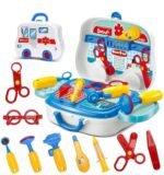 - Includes realistic medical tools such as a stethoscope, syringe, thermometer, scissors, and more.